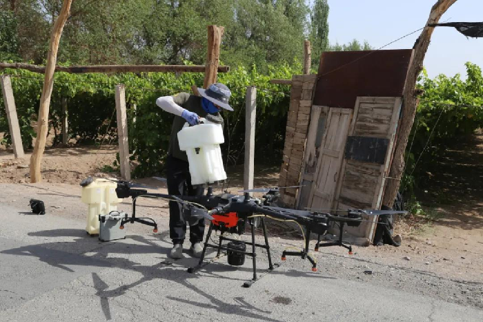 “针对团场的葡萄地病虫害防治,前期采取了为职工免费发放诱捕器、补贴发放迷向丝,进行病虫害的动态数据监测,近期,我们用无人机对葡萄地进行病虫害的统防统治,由团场免费为职工服务。”221团农业发展服务中心工作人员王伟说。