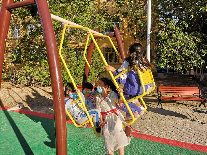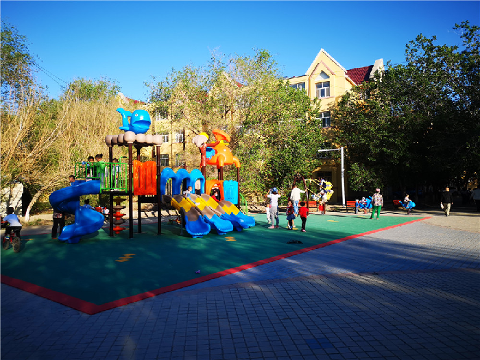 团场居民董红卫也带着孩子来到了社区游乐场,看到崭新的游乐设施,场地边舒适的休闲椅,他高兴的说:“团场确实干了件好事,给孩子们打造了一个很好的乐园,而且铺设好的地垫也让孩子们在这里玩的安全,我们更加放心。”