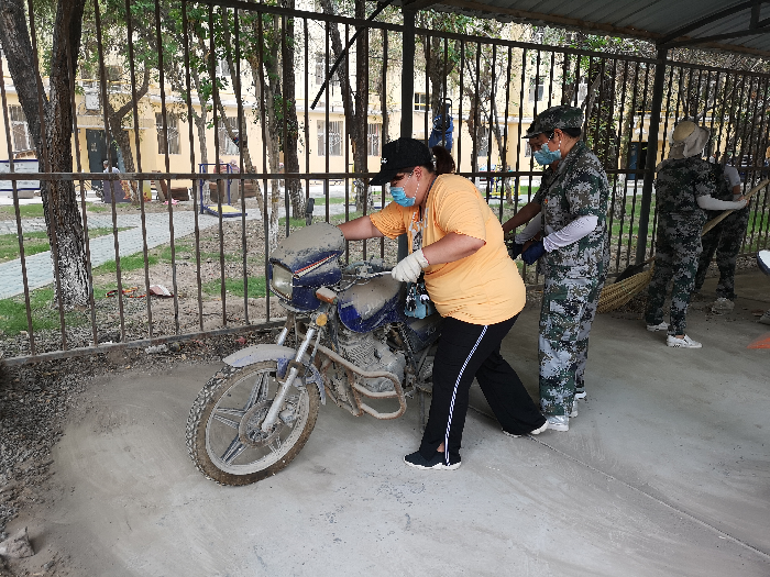 在团部各社区里,爱国卫生运动也在有声有色的开展。8月4日,文幸社区两委、工作人员、下沉干部、志愿者和物业公司的工作人员们组织起来重点对社区停车棚区域进行了清理整治。团场停车棚原是为了为了给居民提供便利的地方,但长年累月停放不使用的“僵尸车”让车棚变成了卫生死角,大家将车棚内的车辆挪开,把车棚内的垃圾彻底清扫干净,然后再把车辆整齐的摆放回原位。一天的功夫,原先垃圾丛生的6个车棚焕然一新,车辆停放整齐有序,卫生环境有了很大改善。