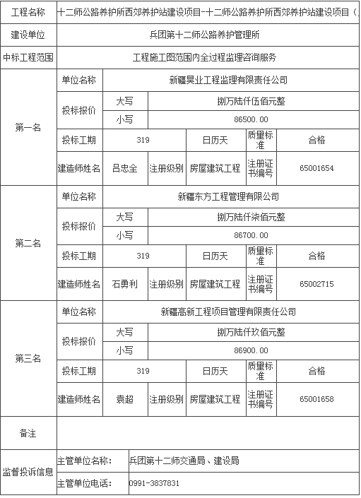 十二师公路养护所西郊养护站建设项目(监理)中标候选人公示