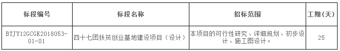 四十七团扶贫创业基地建设项目(设计)已经由新疆生产建设兵团第十二师发展改革委员会以师发改发【2018】223号批准建设。招标人为新疆生产建设兵团第十四师四十七团城镇管理服务中心,工程所需资金来源为政府。项目已具备招标条件,现对该项目的四十七团扶贫创业基地建设项目(设计)进行公开招标。本项目发改委立项批复投资额为3070.69万元;本次招标额为3070.69万元。本工程拟采用资格后审方法选择合格的投标报名人参加投标。