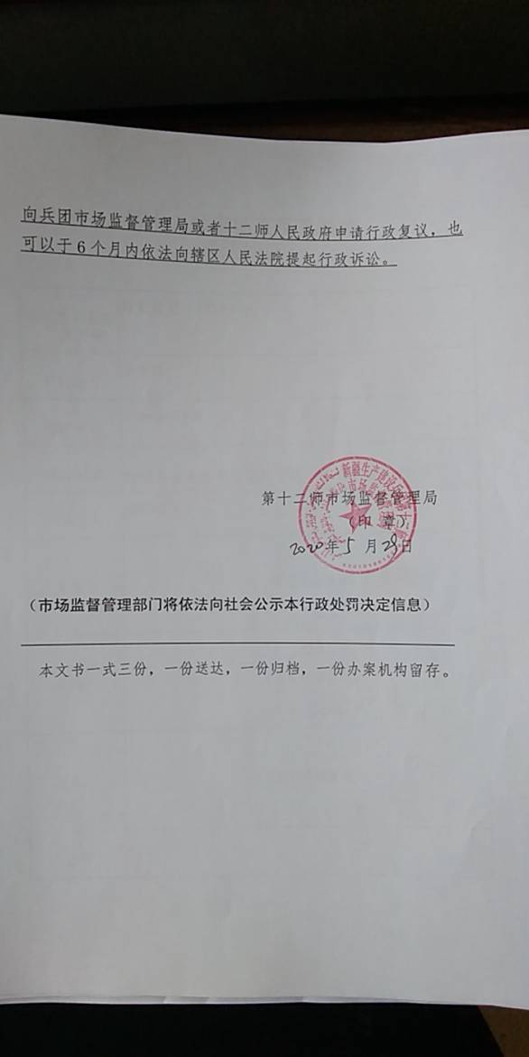 如不服本处罚决定,可在接到本处罚决定书之日起60日内向兵团市场监督管理局或者十二师人民政府申请行政复议,也可以于6个月内依法向辖区人民法院提起行政诉讼。