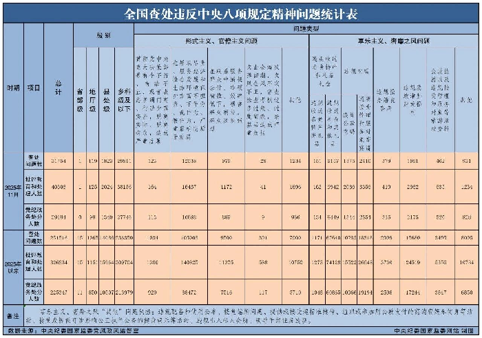 12月22日,中央纪委国家监委公布了2025年11月全国查处违反中央八项规定精神问题汇总情况。当月,全国共查处违反中央八项规定精神问题31754起,批评教育和处理40306人,其中党纪政务处分29184人,这是连续第147个月公布月报数据。