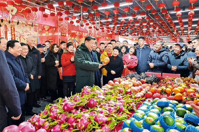 2025年1月22日至24日,中共中央总书记、国家主席、中央军委主席习近平冒着严寒来到辽宁,看望慰问基层干部群众。这是23日上午,习近平在沈阳大东副食品商场考察时,同店主和顾客亲切交流。 新华社记者 王晔/摄