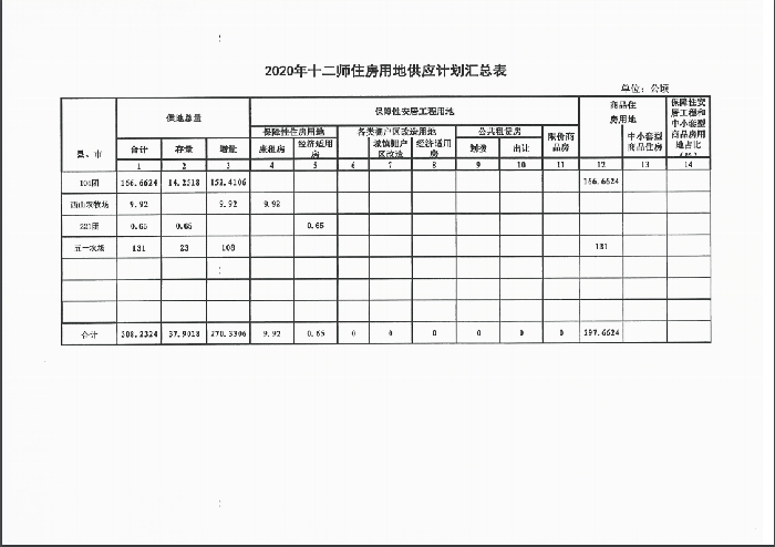 2020年十二师住房用地供应计划及存量住宅用地信息