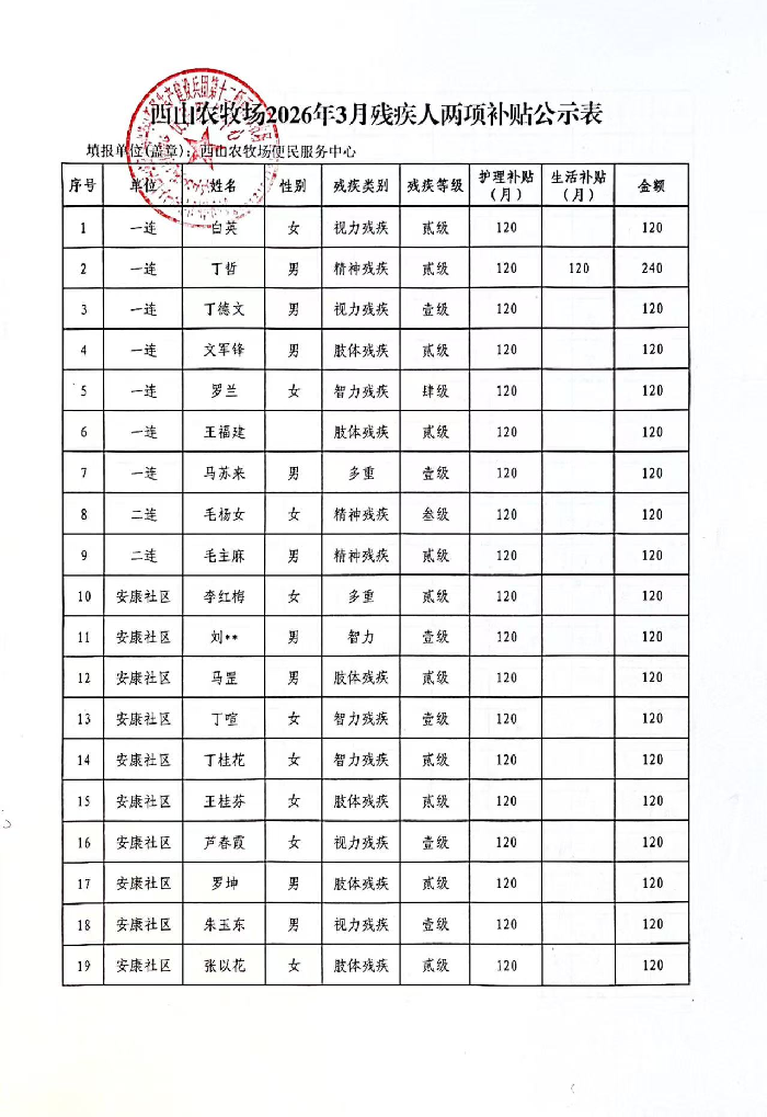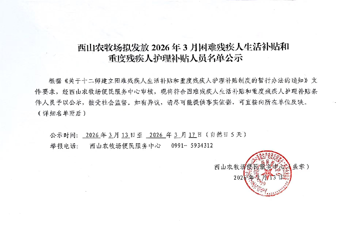 西山农牧场拟发放2026年3月困难残疾人生活补贴和重度残疾人护理补贴人员名单公示。