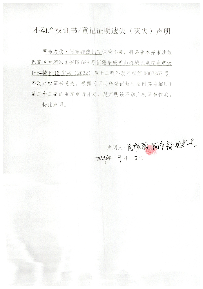 不动产权证遗失声明 (阿布力孜·阿布都热扎克3)