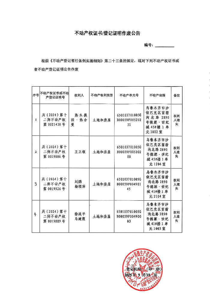 不动产登记证明作废公告(热木提拉·热合曼等4人)