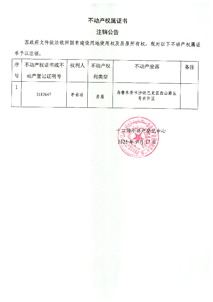 不动产权证书注销 李有功