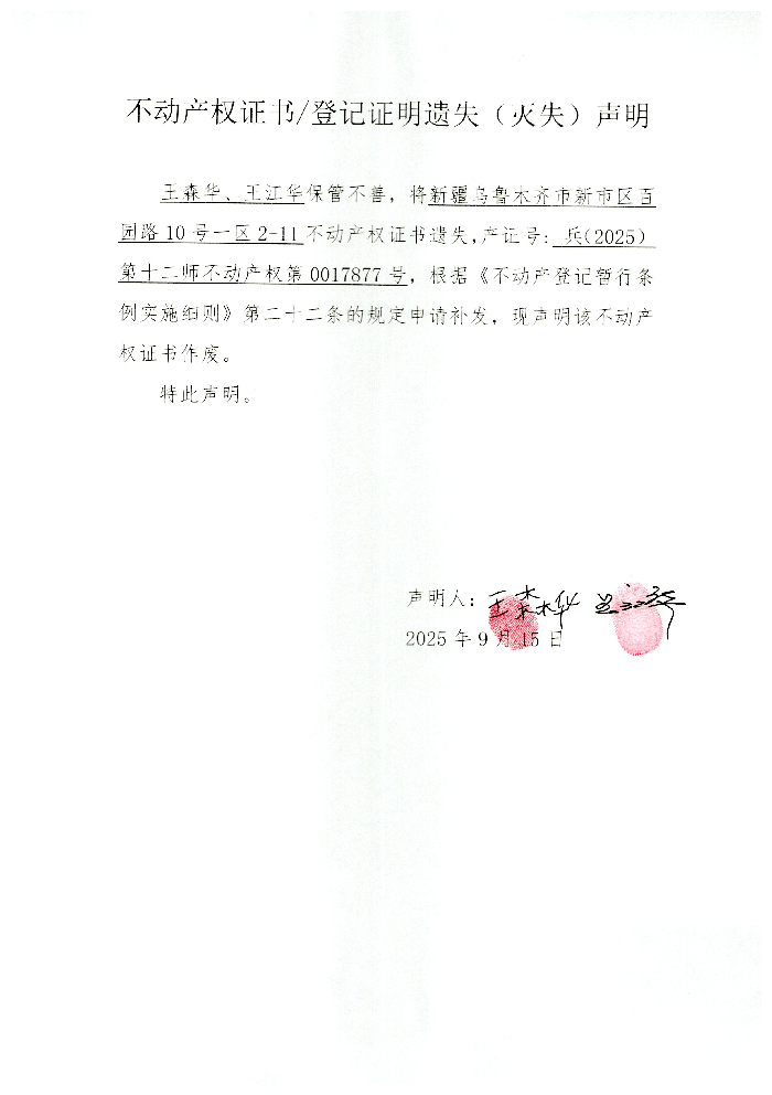 不动产权证书遗失 王森华 王江华