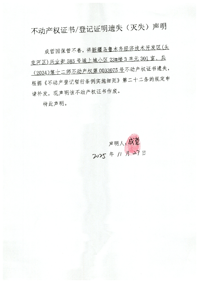成哲不动产权证书遗失声明