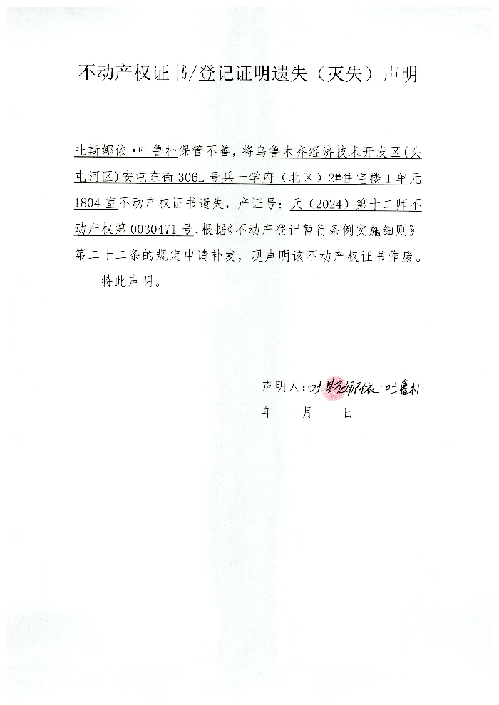 吐斯娜依·吐鲁朴不动产权证书遗失声明