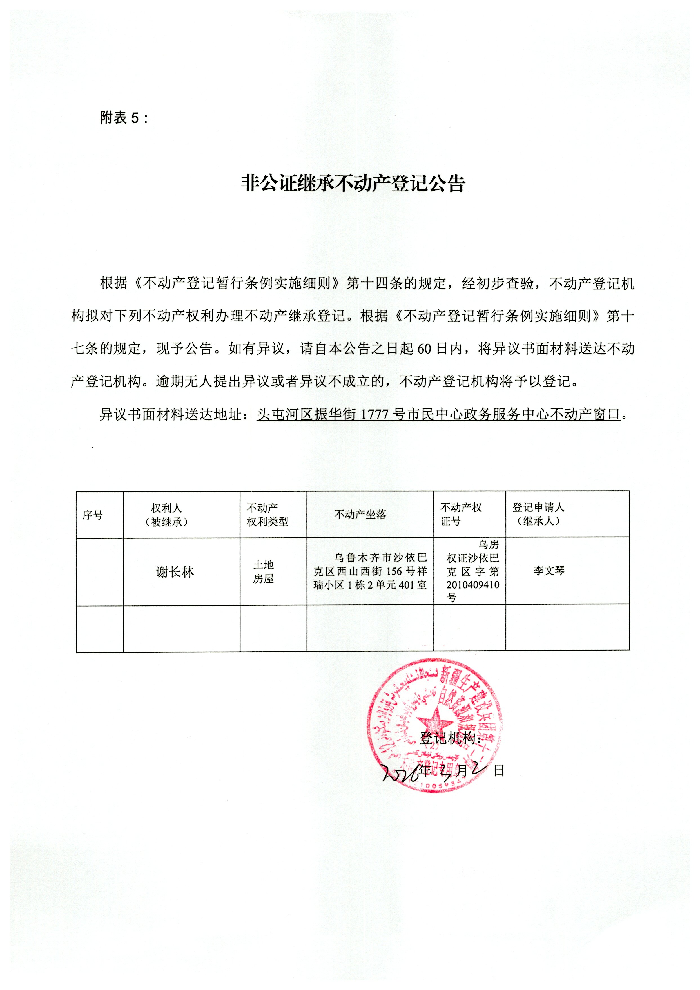 谢长林非公证继承不动产登记公告